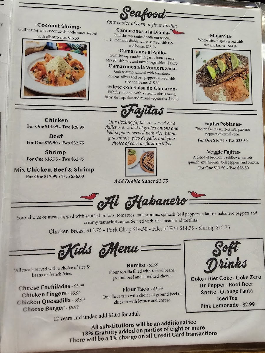 Your choice of meat, topped with sauteed onions, tomatoes, mushrooms, spinach, bell pepper, cilantro, habanero peppers and creamy tamarindo sauce, served with rice, beans and tortillas.